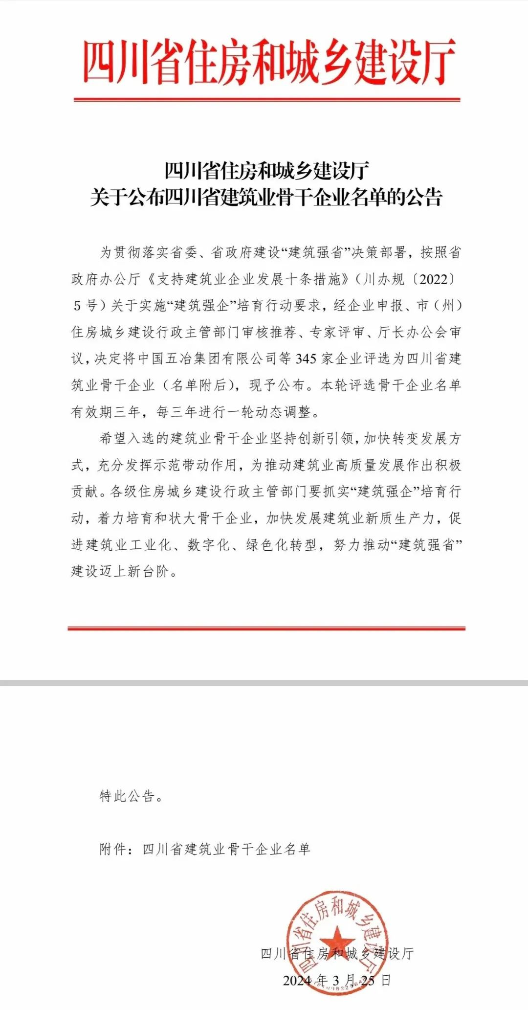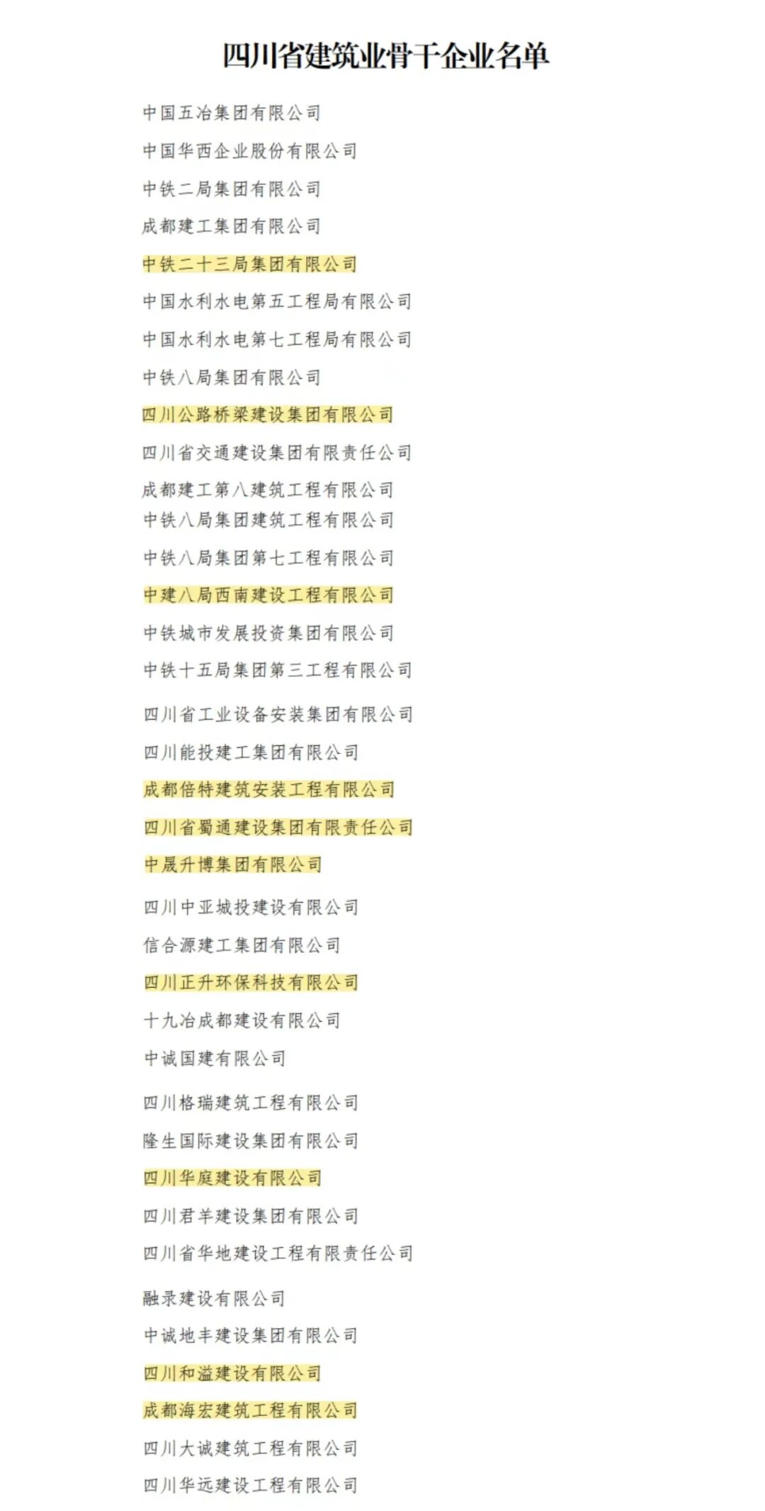 3月25日,四川省住房和城乡建设厅发布《关于公布四川省建筑业骨干企业名单的公告》,其中成都高新区建设行业协会会员单位四川公路桥梁建设集团有限公司、倍特建筑安装工程有限公司、中铁二十三局集团有限公司、中建八局西南建设工程有限公司、四川省蜀通建设集团有限责任公司、四川和溢建设有限公司、成都海宏建筑工程有限公司、中晟升博集团有限公司、四川华庭建设有限公司、四川正升环保科技有限公司共计10家单位被评选为“四川省建筑业骨干企业”,在此热烈祝贺以上单位获此荣誉。